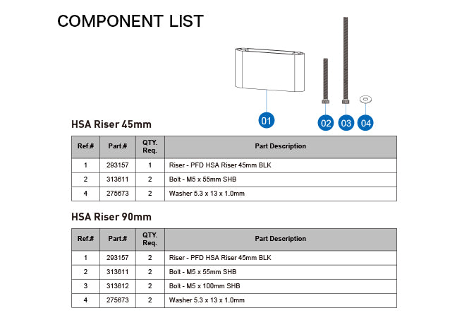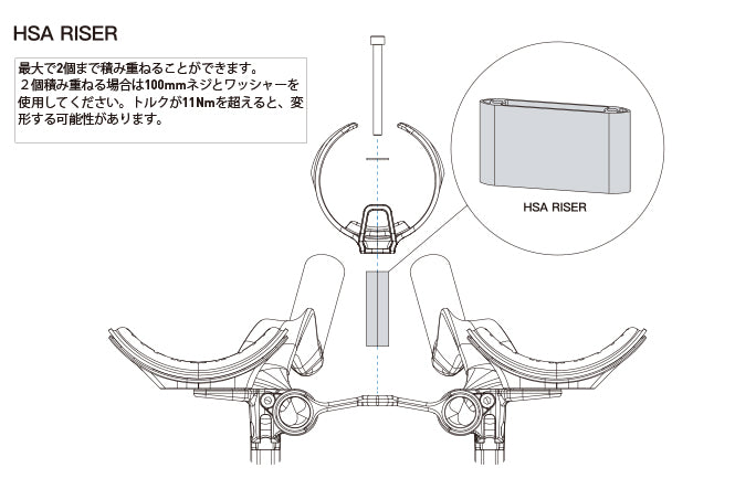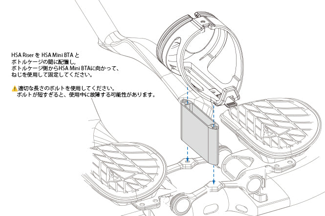HSAライザーは、BTAブリッジに取り付けることで、ボトルを45mm高く設置できます。ライザーを積み重ねることで最大90mmの高さまで対応可能です。